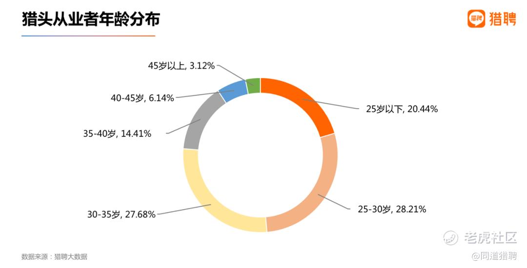 猎头行业是一个相对年轻的行业,从业者也呈现出年轻的特征。猎聘大数据显示,30岁以下的猎头从业者占总数48.65%,30-35岁从业者占27.68%,35-40岁从业者占14.41%,40岁以上从业者合计占9.26%。