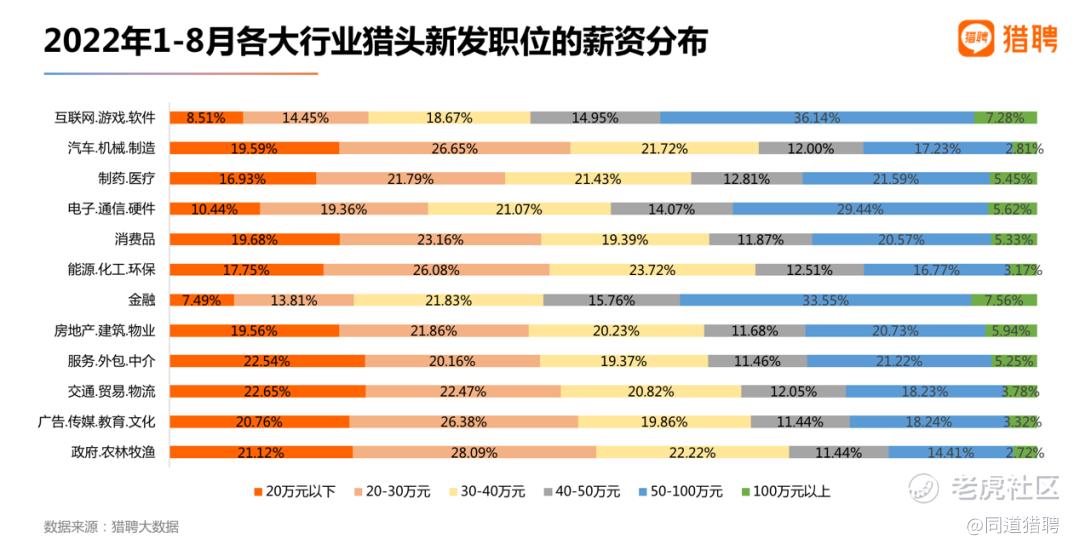 各个行业薪资水平和招聘需求不同,委托猎头发布的职位呈现出不同的薪资分布特点。如果以50万元作为分界线,可以看到互联网/游戏/软件、金融、电子/通信/硬件行业年薪50万元以上的职位,在各自行业内占比较大,分别达到43.42%、41.11%、35.06%。