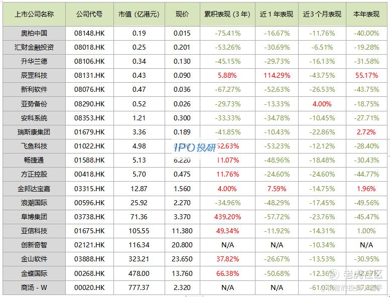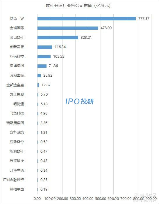 3、市值最高的是商汤-W(00020.HK),市值为777.37亿元;市值最低的是奥柏中国(08148.HK),市值为0.19亿元。