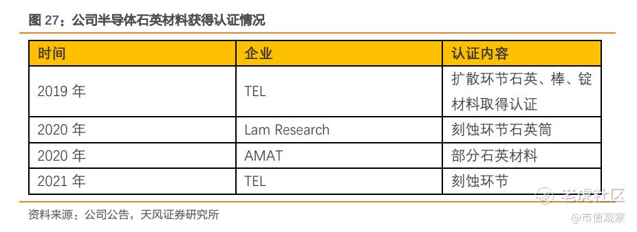 石英制品下游半导体设备商集中度高,资质认证是产业准入关键。近几年来,公司不断加快半导体石英认证工作,现已完成全球三大半导体企业东京电子(TEL)高温/低温刻蚀、泛林半导体(LAM)高温刻蚀和美国应用材料(AMAT)的认证。