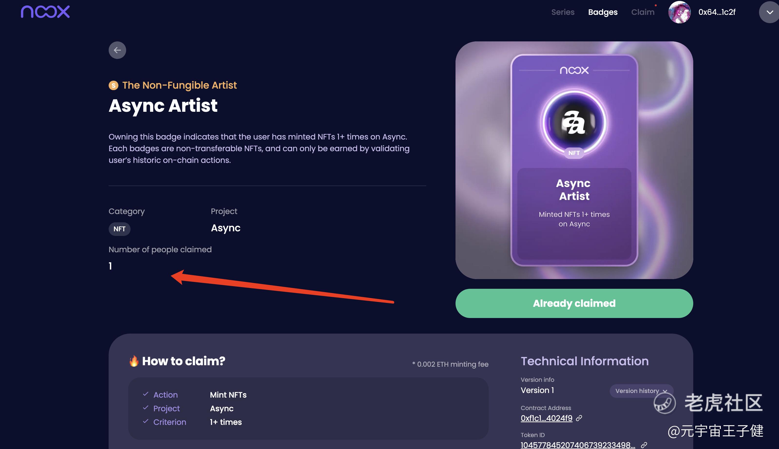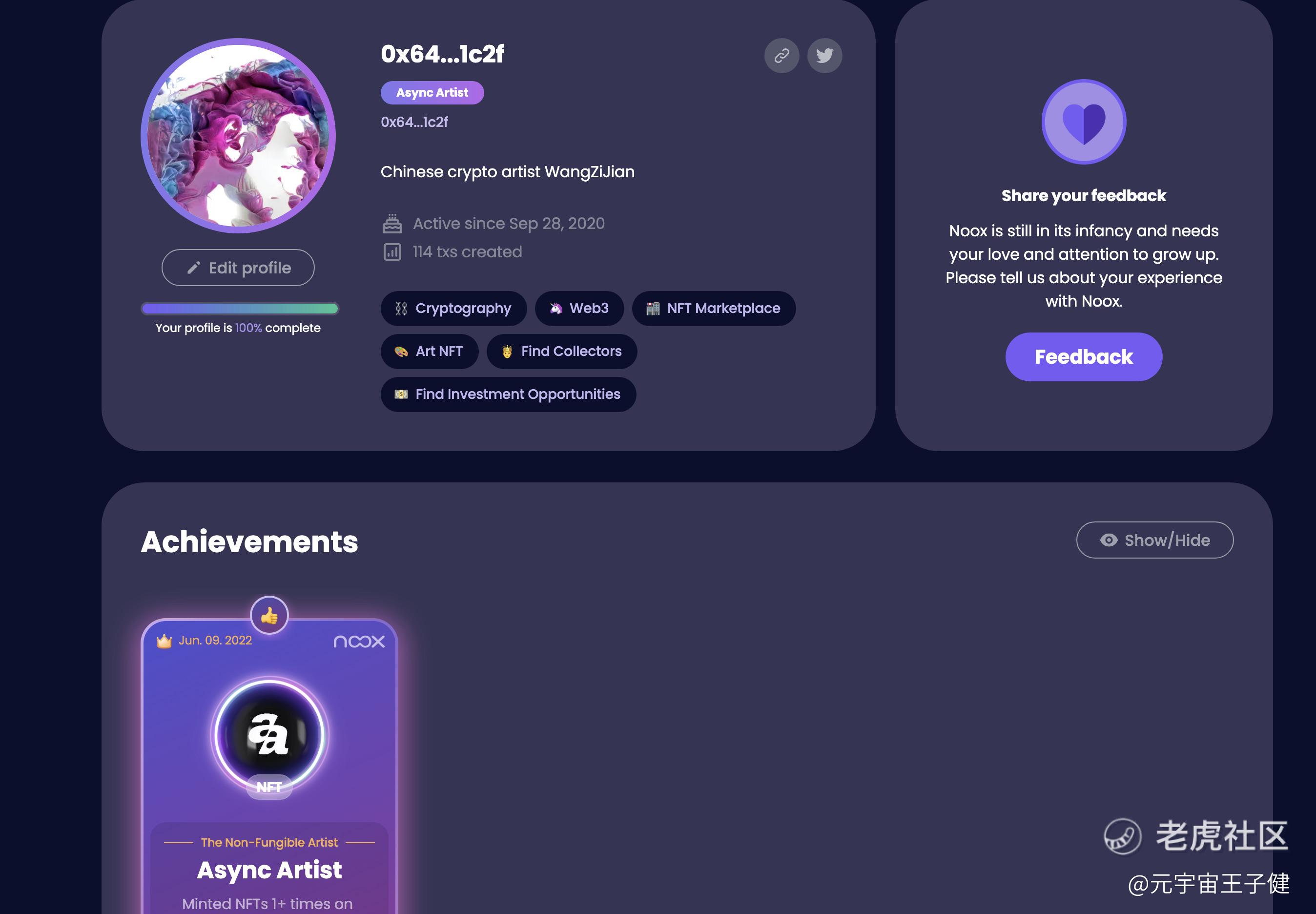 成为了NOOX平台上第一个领取Async Artist成就的人。我之前也想做的NOOX这样的Web3.0成就系统平台,但没找到合适的合作伙伴就没启动。