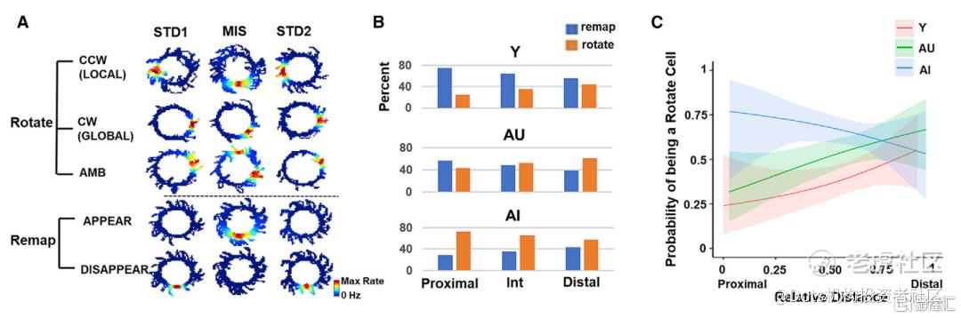 当环境的相似性较低时,即在不同房间内,所有大鼠的 CA3 近端和远端表征均被映射,表明在记忆受损的老年大鼠(AI)的 CA3 能够对差异较大的输入进行编码特异性表征,这意味着可能存在某些特殊的机制让它们大鼠弥补了这一缺陷。