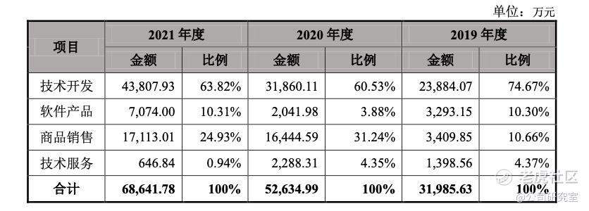从收入构成来看,华如科技的收入主要以技术开发项目为主,2021年,技术开发收入4.38亿,占比64%;商品销售1.71亿,占比25%。