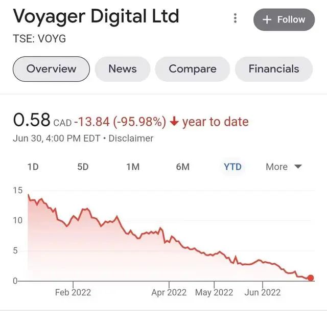 平台“拔网线”的消息爆出后,Voyager的股票在美国场外交易市场跌幅一度高达43%,最终收跌30.68%,报0.30美元/股。