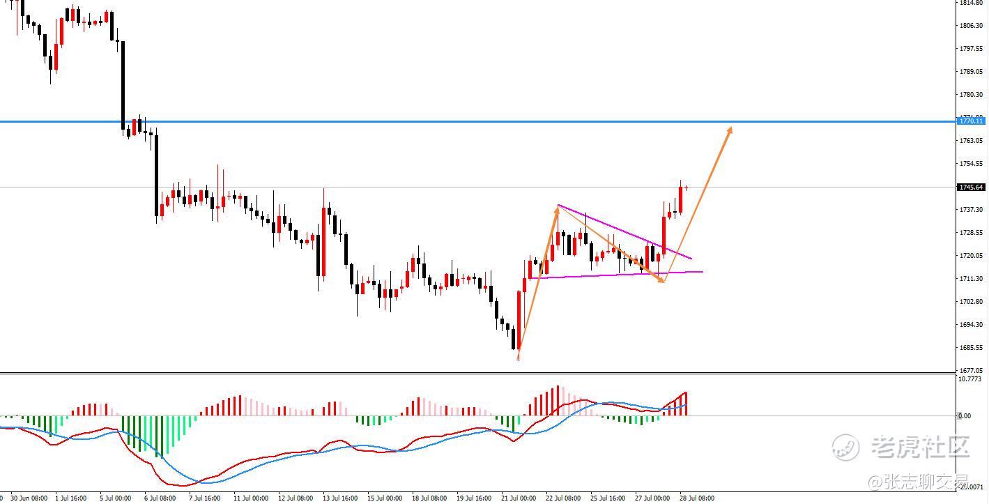 从结果来看基本符合预测,金价从数据前1713直接涨到了1740,今天亚盘延续的多头的强势,再次突破新,截止发稿已经到达了月初的盘整高点区域。