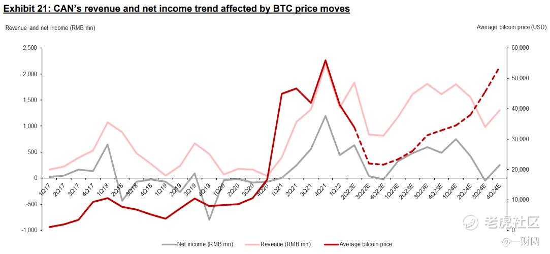 挖矿业务方面,(收入占该公司2021年总营收的0.4%;华兴资本预计在2022年将大幅增长,收入同比增长385%;2021-2024E年的复合增长率为113%)。华兴资本在报告中指出,该公司将其10%以上的矿机库存分配给挖矿业务。该公司能以更低的成本和更少的盈亏平衡天数来对抗周期性波动。当BTC价格反弹时,该公司能够将这些库存作为二手设备出售给矿业公司的矿场,从而获得更高的毛利率。