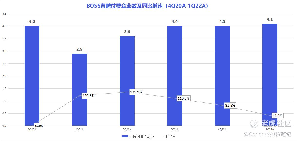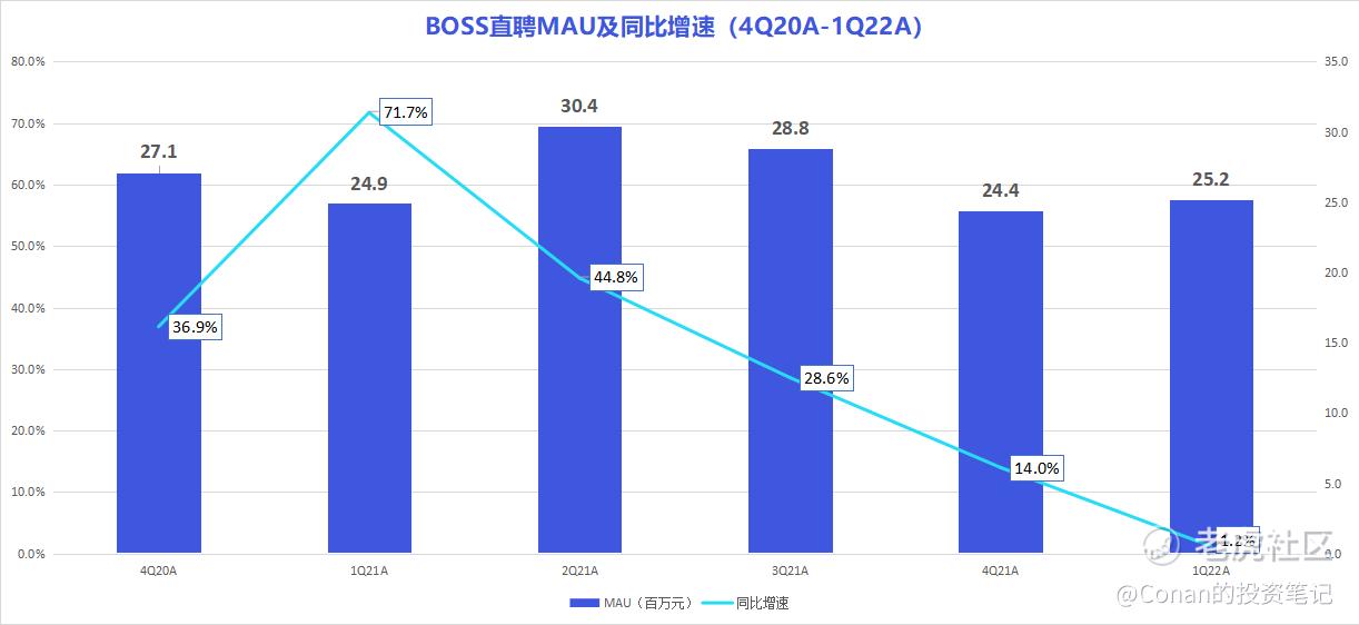 - 2022年1QBoss直聘的企业客户招聘服务收入11.27亿,同比增长44.1%,环比增长4.2%;