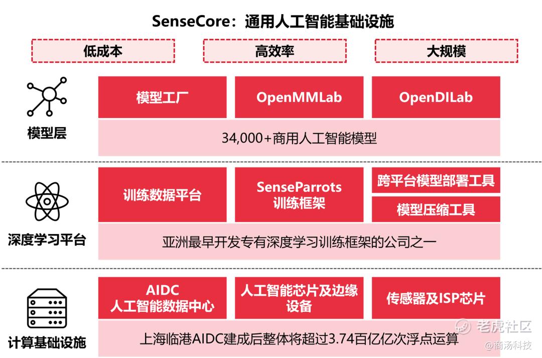 SenseCore商汤AI大装置作为商汤赋能百业的核心技术能力,由模型层、深度学习平台、计算基础设施三部分构成。作为智能算力、通用算法和开发平台一体化的新型智能基础设施,SenseCore提供AI通用大模型训练能力,并实现针对场景的AI应用模型的规模化量产,从而大幅降低了AI的生产成本,实现了AI赋能百业。