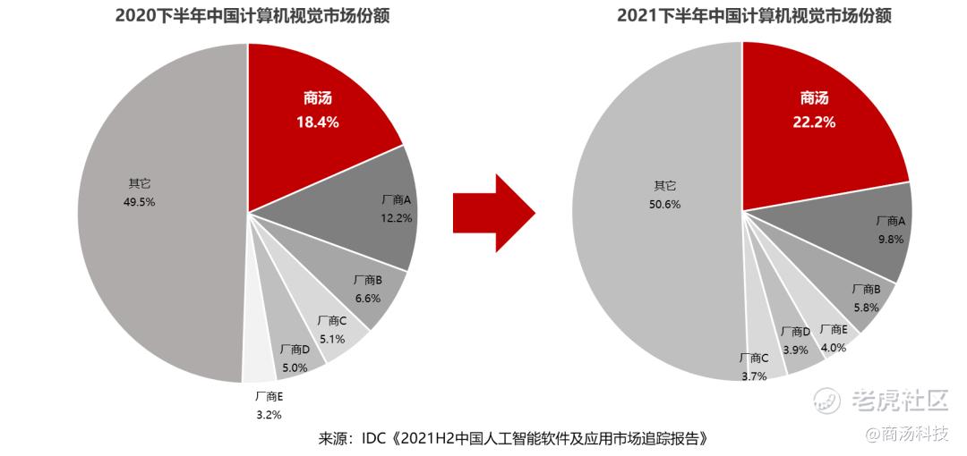 智研君:近日,国际数据公司(IDC)发布《2021H2中国人工智能软件及应用市场追踪报告》,报告显示,在各厂商市场份额普遍下滑的大趋势下,商汤科技维持同比增长近4个百分点的优秀战绩,2021下半年继续保持计算机视觉市场第一,市场份额为22.2%,已连续五年保持市场第一位置。