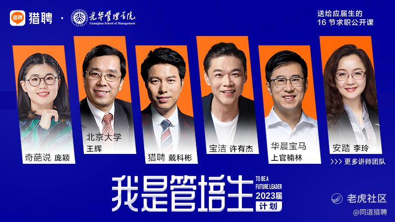 值得一提的是,6月21日,北京大学光华管理学院党委副书记王辉教授将以《00后们,美好的人生从职业生涯规划开始》为主题开启“我是管培生”计划系列公益直播课的首节课程,该课程将在猎聘APP、猎聘视频号、北大光华视频号、北大光华B站、网易云课堂等渠道同步播出。
