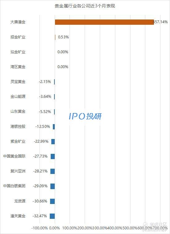 近3个月涨幅最大的是大唐潼金(08299.HK),涨幅为657.14%;跌幅最大的是潼关黄金(00340.HK),跌幅为-32.47%。