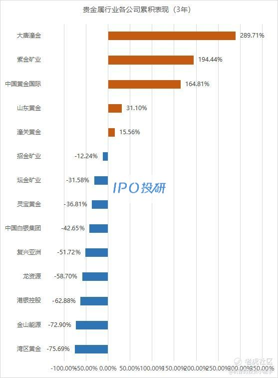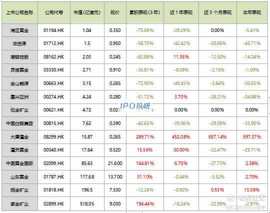 累计表现涨幅最大的是大唐潼金(08299.HK),涨幅为289.71%;跌幅最大的是湾区黄金(01194.HK),跌幅为-75.69%。