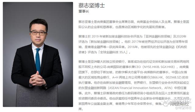 加入尚乘集团后,蔡志坚主导股权重组,引入了包括摩根士丹利、瓴睿资本集团等战略股东,目前除了担任尚乘集团董事会主席兼总裁,还在由新加坡金融管理局、世界银行、东盟银行业协会共同发起成立的东盟金融创新网路中担任董事。