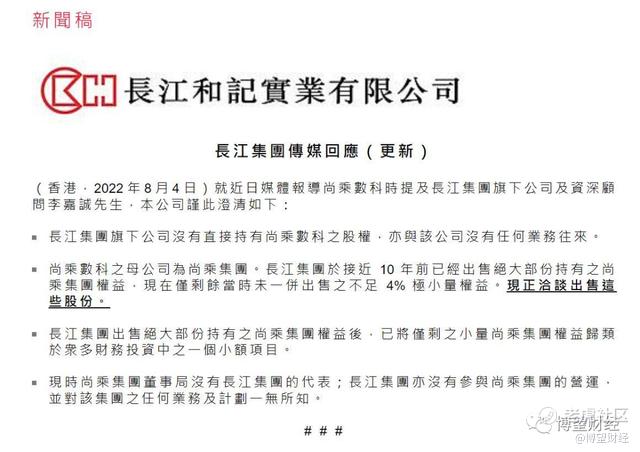 8月4日,李嘉诚旗下长江集团在官网发布新闻稿澄清称,“集团旗下公司没有直接持有尚乘数科之股权,亦与该公司没有任何业务往来。”