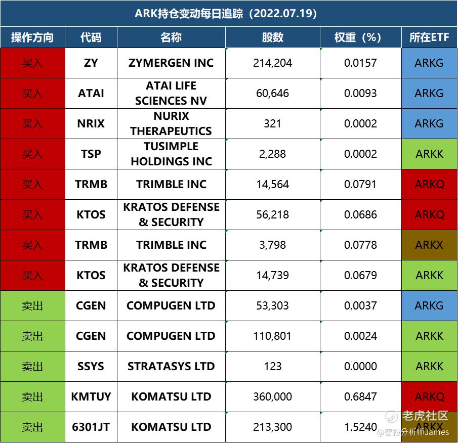 【Ark旗下基金持仓变化小结,2022年07月19日】