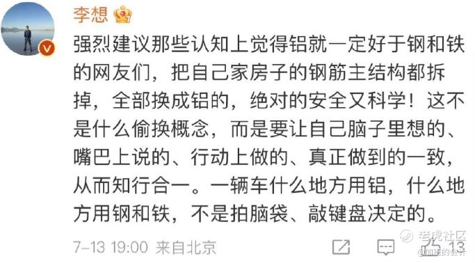 不过,对于这一质疑,李想直接在社交平台“开喷”,他表示:“觉得铝就一定好于钢和铁,把自己家房子的钢筋主结构都拆掉,全部换成铝的。一辆车什么地方用铝,什么地方用钢和铁,不是拍脑袋、敲键盘决定的。”