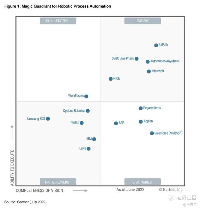 7月25日,国际权威分析机构Gartner发布了2022全球RPA魔力象限报告(Gartner RPA MQ),UiPath、Automation Anywhere、微软等来自全球的15家厂商入选该报告。