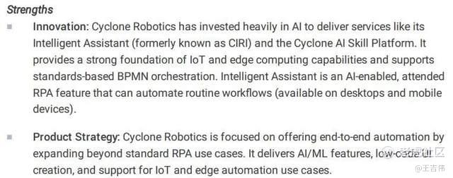 在产品战略层面,Gartner认为弘玑Cyclone基于标准RPA场景为客户提供端到端的自动化解决方案,其中包括AI/ML能力,低代码构建能力,物联网(IoT)自动化能力以及边缘自动化能力。