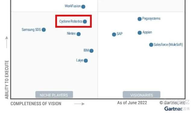 事实上,不同的组织对于自动化的需求也不尽相同,所以并非只有LEADER象限的厂商才是最适合客户需求的,入选MQ报告的每一家厂商都会进入不同客户的技术采购清单。弘玑Cyclone在利基市场象限中在执行能力上最强,也是当前执行能力最强的亚洲RPA厂商。