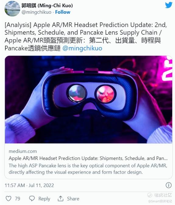 今日,郭明錤在个人推特上发布苹果AR/MR头戴设备预测更新报告。