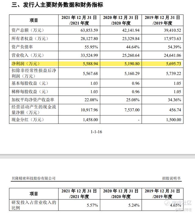 依靠这些知名客户,贝隆精密近年收获了不菲的业绩表现。2019年-2021年营业收入分别为2.46亿元、2.53亿元和3.35亿元;净利润分别为5695.73万元、5190.8万元和5588.94万元。