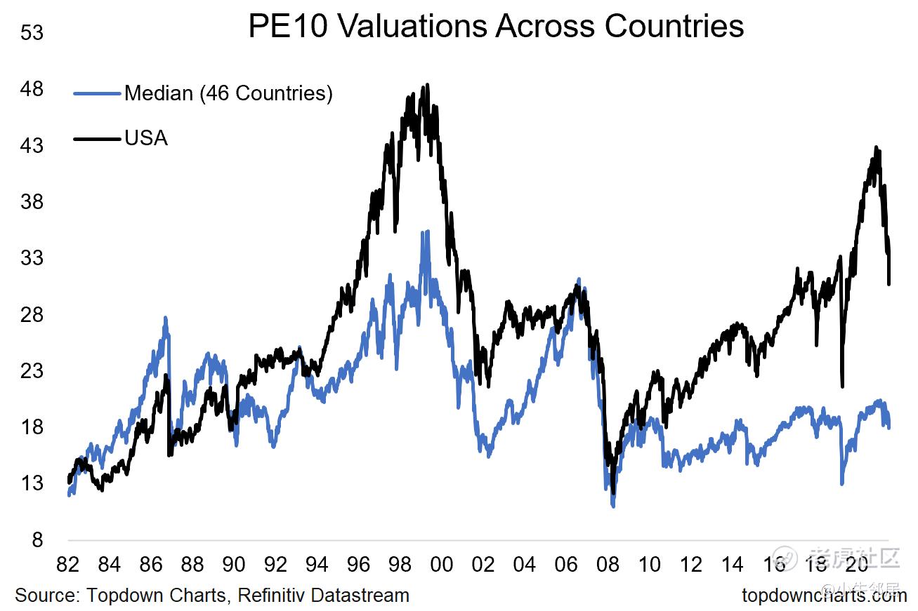 世界其他地区也离近期历史的最高水平不远(看上去比美国便宜,而且从长期的历史标准来看也算便宜不少了)(蓝线是46国平均,黑线是美股)