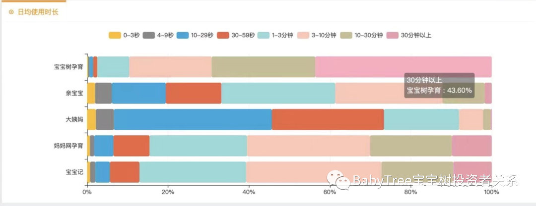 国内权威数据机构Quest Mobile四月互联网用户数据显示,在主流母婴App中,宝宝树集团旗下的核心App宝宝树孕育月活跃用户规模、人均使用时长均位列第一,日均使用时长30分钟以上的深度用户远超其他同类产品。在移动互联网趋于存量市场争夺时,头部互联网公司已告别唯流量论的粗放阶段,进入精细化单客价值挖掘的阶段。因而人均用户时长是移动互联网产品商业价值的关键度量,该维度直接关联广告消耗效率与商品变现能力,考验的是平台真正有深度、有价值的用户运营能力。