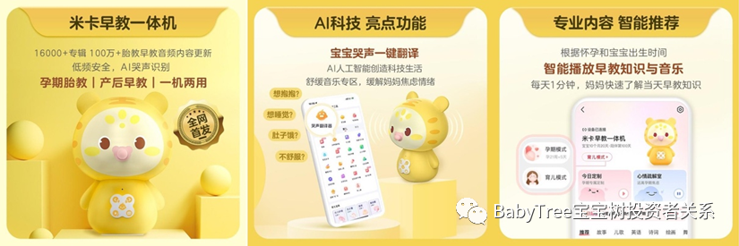 在C2M电商消费领域,宝宝树的“品效合一”商业链路从平台用户需求深度洞察出发,深度链接国内头部供应链企业,从专业研发、开品,到运用用户运营能力销售,提升母婴消费供需匹配效率。宝宝树于2022年4月29日发布上线了宝妈奶爸们全新孕育好帮手“米卡早教一体机”,覆盖从妈妈孕期到宝宝6岁的育龄阶段,首发于3分钟内售罄。