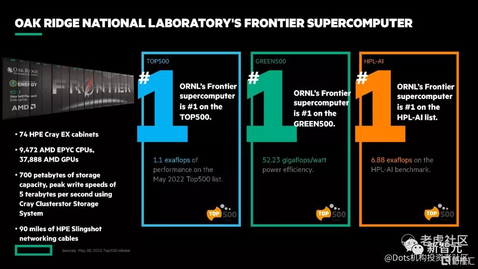 除了如此炫目的算力之外,Frontier还是全球跑AI最快的超级电脑之一。在HPL-AI基准的混合精度性能测试中,Frontier跑出了6.88 ExaFlops的成绩。