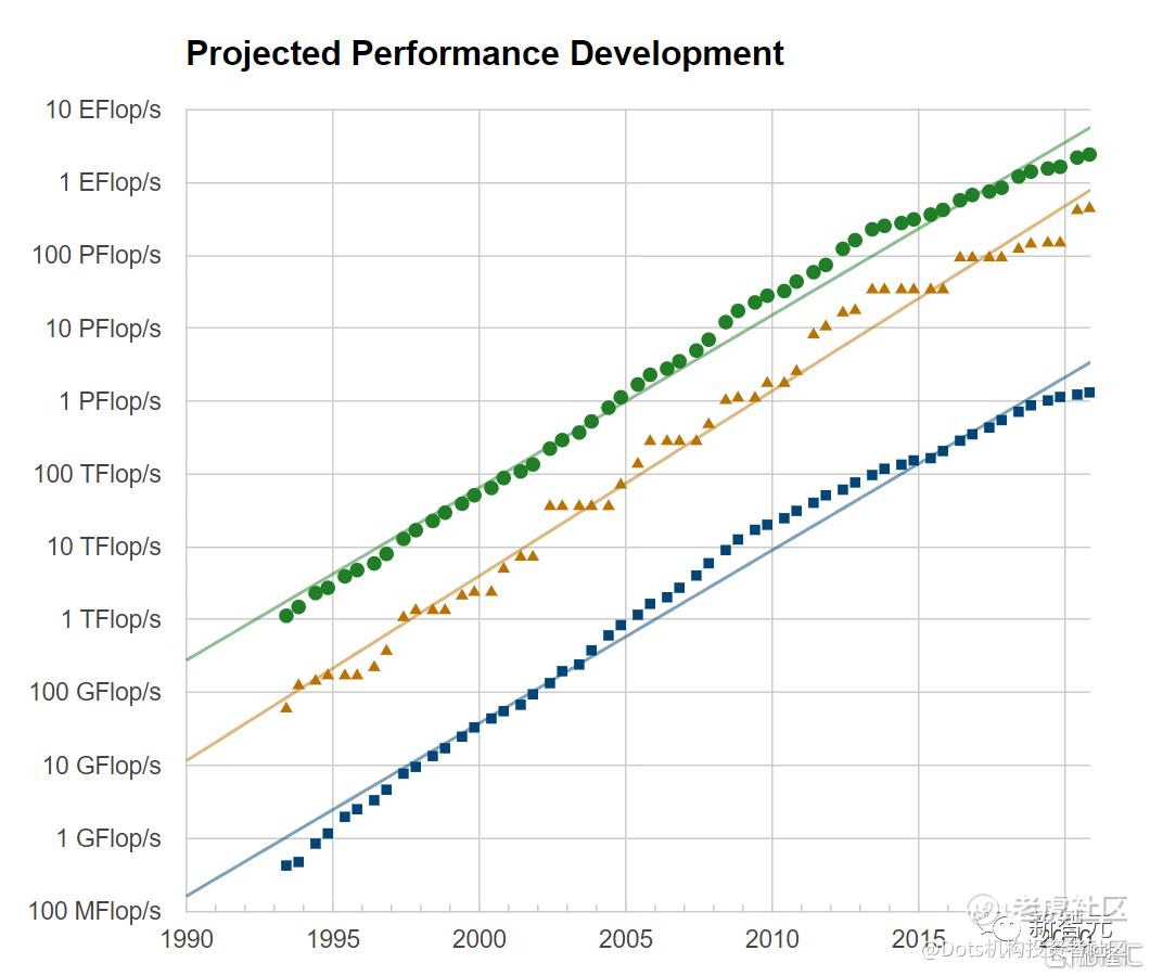 可以看到,这三条直线大致符合摩尔定律的对算力提升的预测性判断。