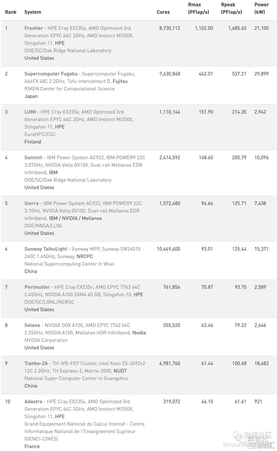 凭借1.102 Exaflop/s的HPL分数,Frontier不仅是有史以来最强大的超级计算机,它也是第一台真正的「E级超算」。
