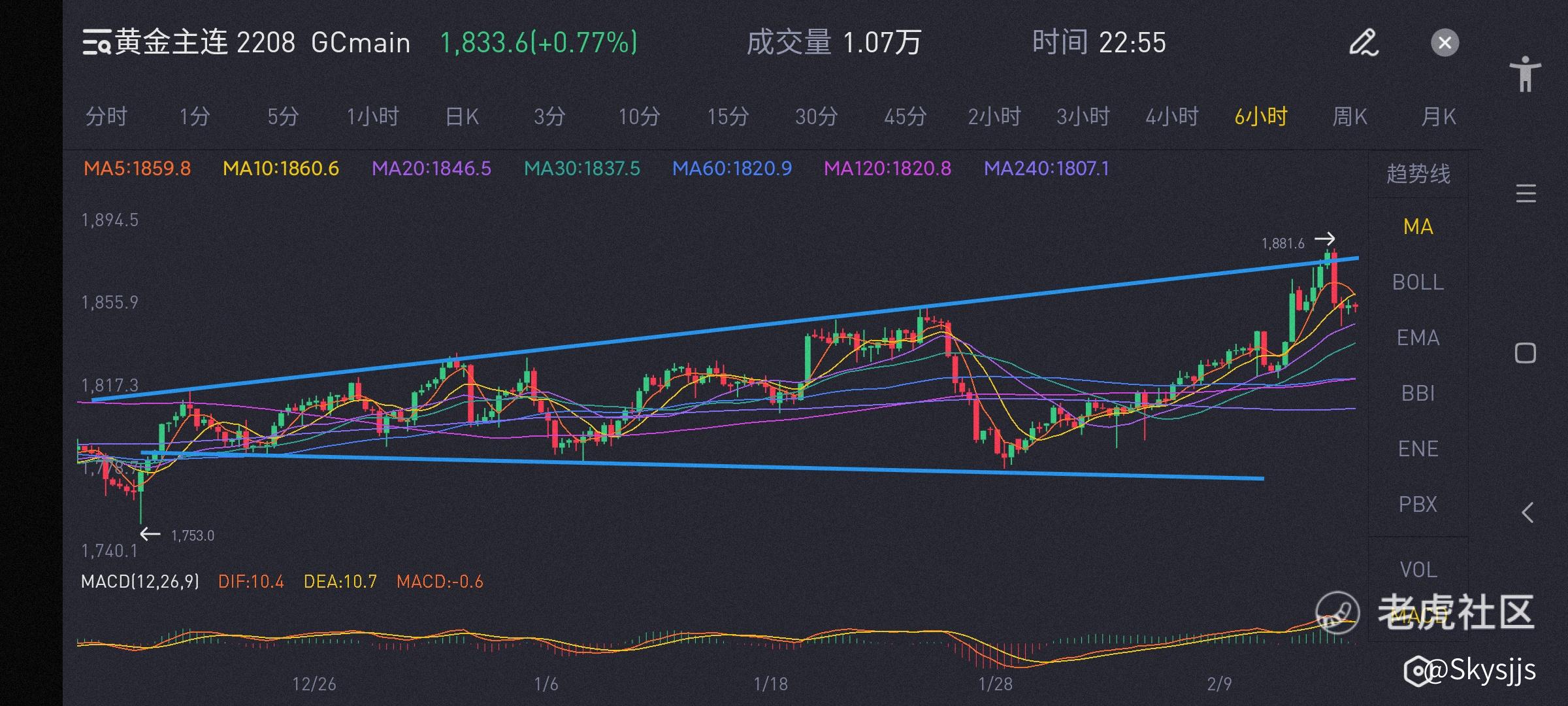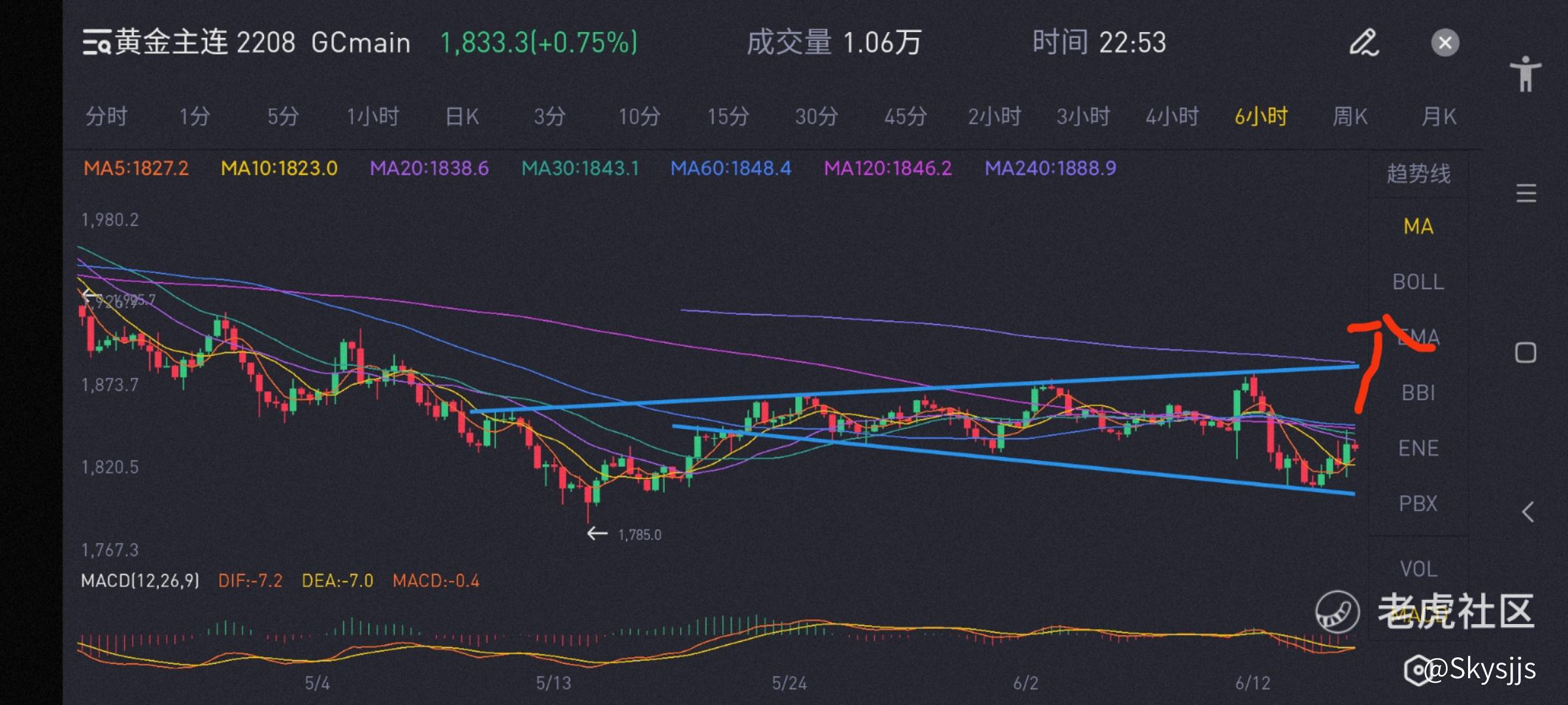 $黄金主连 2208(GCmain)$此时此刻,跟年初的结构不能说有点类似,只能说完全一样。当然箭头画的角度太高了,接下来应该会涨幅放缓,缓慢爬坡,还可能跟年初一样迅速跌到低点附近又迅速拉回来。涨得快不是好事,三角形的上部边界需要时间打开,到达的时间越晚,那么破位时的点位就越高。