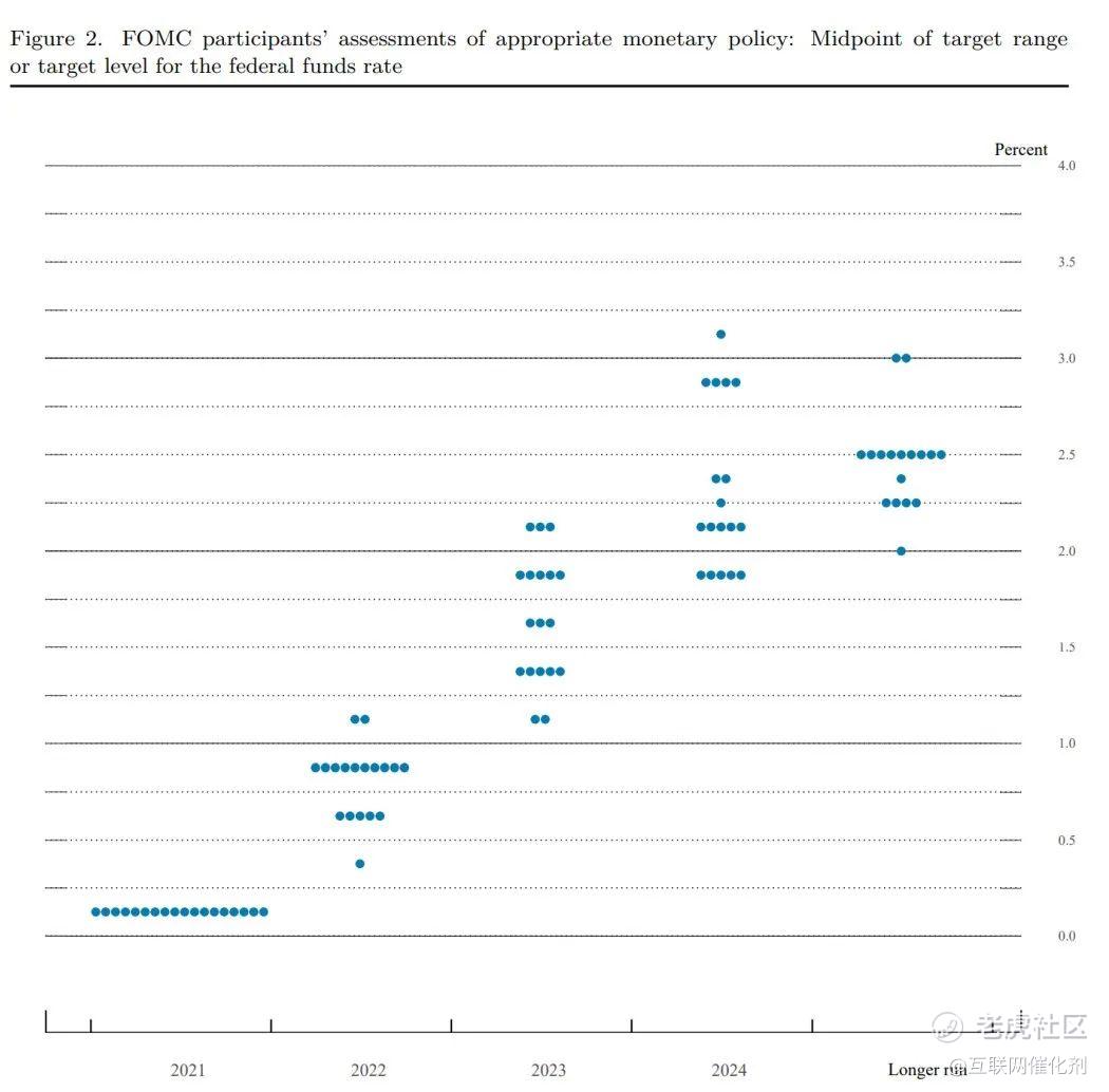 3、上调了今年的通胀预测PCE通胀4.2%→5.3%,核心PCE通胀3.7%→4.4%,明后年通胀预测亦有所上调。