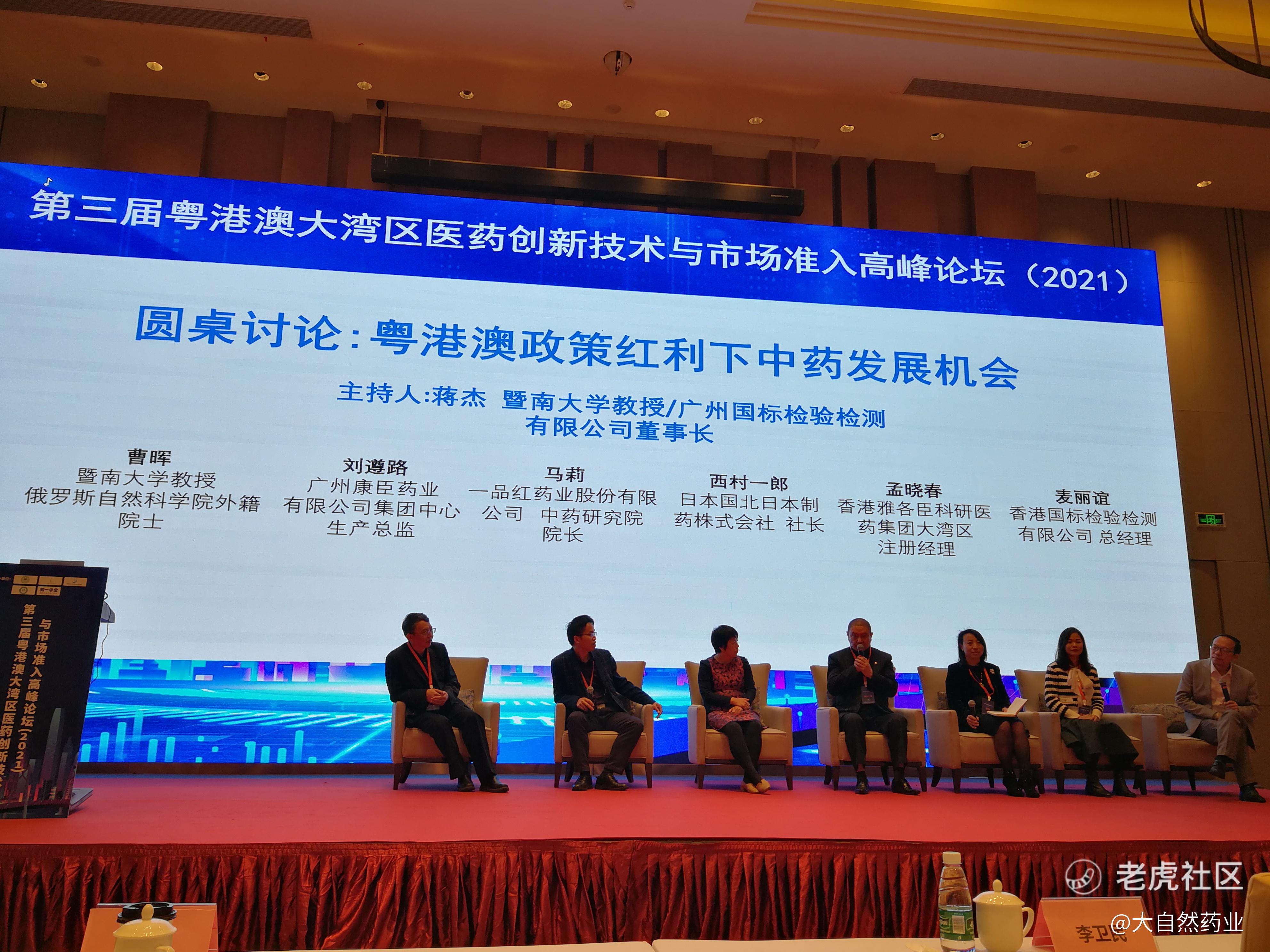 大自然药业股份有限公司外国专家、日本国北日本制药株式会社社长西村一郎,暨南大学教授、俄罗斯自然科学院外籍院士曹晖以及香港上市药企负责人应邀参加了暨南大学教授蒋杰主持了粤港澳政策红利下中药发展机会圆桌讨论,西村一郎向线下线上与会领导、专家、同业精英介绍了大自然药业与北日本制药在资本与业务层面的合作以及合作体会密切关注和充分利用粤港澳大湾区中医药政策红利,把握中医药发展难得的大好机遇,通过新药研发利用好ICH平台实现中日双申双报,进一步拓展中药改良型新药、古代经典名方向日本、东南亚、一带一路沿线国出口途径与额度,以及将日本汉方药品通过澳门注册而实现在粤港澳大湾区销售,全力打造双循环中药制业企业的战略目标与发展路径,引起了与会人员的高度热议和学者专家们的赞誉。