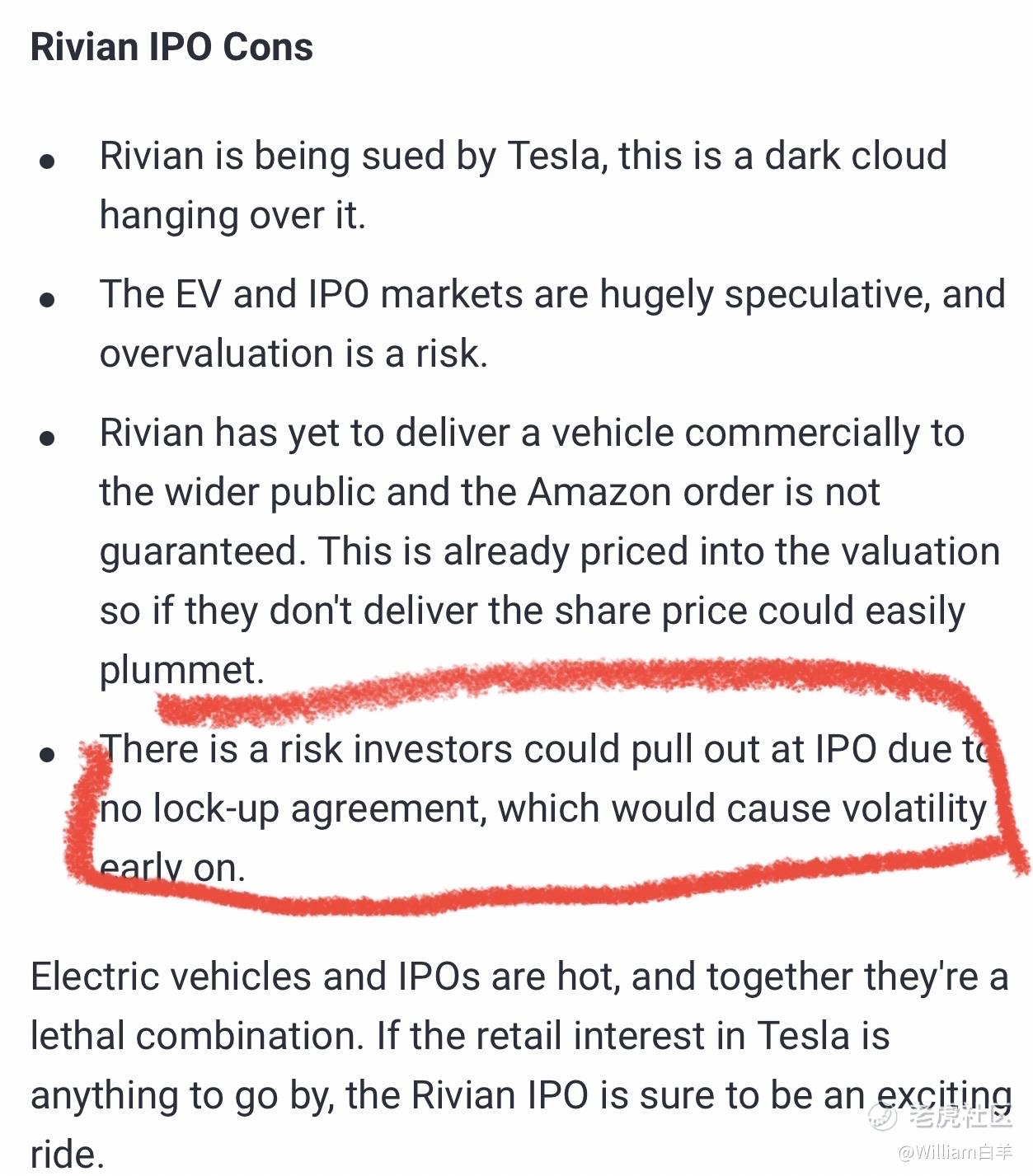 $Rivian Automotive, Inc.(RIVN)$发觉rivian 没有锁定期看下面红圈内英文,大概意思是 由于没有禁售协议,投资者有可能在首次公开发行( IPO )时退出,可能上市就引发震动!初期庄家投资者可能早就套现很多了,怪不得收买很多分析师说好!