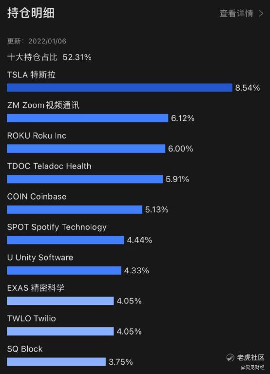 具体到其重仓股的表现,据CNBC统计,截止2022年1月6日,特斯拉$特斯拉(TSLA)$ 、Zoom视频通讯、Roku、Teladoc Health为ARKK的前三大重仓股。