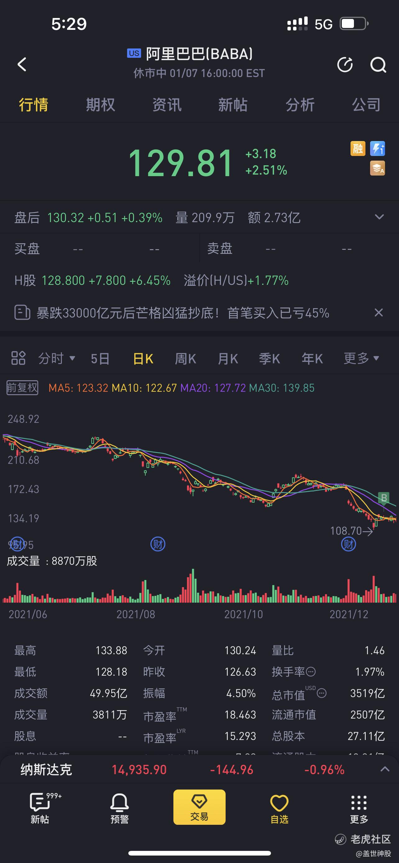 在阿里120的时候满仓阿里 后来还加了杠杆.从周期来看个人感觉阿里已经是相对底部区域了!