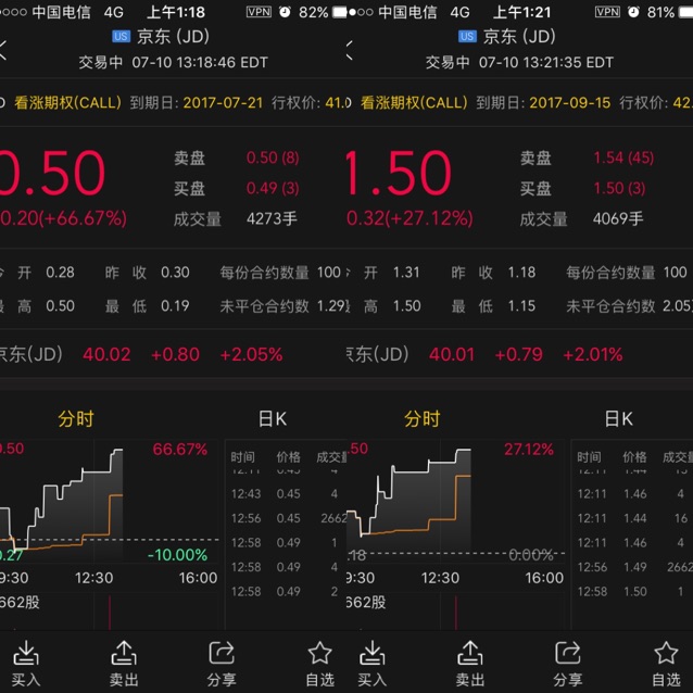 如下图,刚刚大神在12.56分卖出了2662手近期价外期权,又买入了2662手远期价外期权,很明显这是一份日历套利策略,很明显对方认为近期京东不会涨过41块,果然大神就是不一般,根据概率7月21日涨过40.31的概率为31.5%,低于41的概率为81.95%,想必也是出于这个考虑的吧…越来越喜欢期权了,感觉像下棋一样进行布局😉