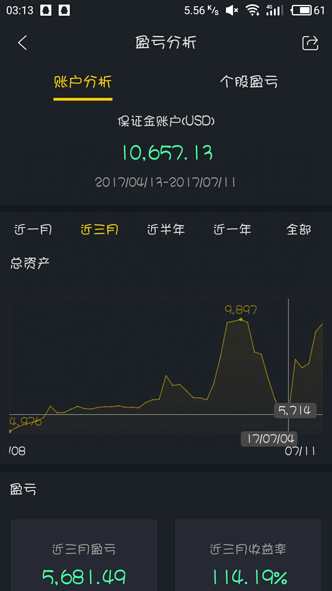 美股萌新5月8日入金5000,两个月实现翻倍。 中途差点跌回原型,还好该割肉的割肉,损失控制在承受范围内。 我承认我不是一个价值投资者,只是个投机者。钱少的时候全仓期权,风险真的很大。等我上了2.5万,就不准备再全仓期权了,撑死买半仓。 一,,心理承受能力不好的还是不要全仓期权,期权跌得厉害千万不能像正股一样补仓,越补越亏,我也是交了学费才知道。