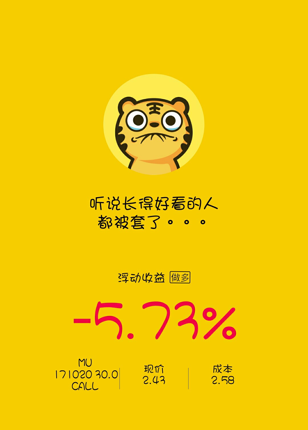 昂,镁光小赚700多美刀昨晚平仓走了,原因818未平仓的期权太多怀疑可能被杀掉。 AMD财报后获利出逃,随后大跌抄底谁知道抄在山顶,再跌补仓又补在山腰,818AMD已废纸,915的亏损75%,AMD目前亏损3800多美刀