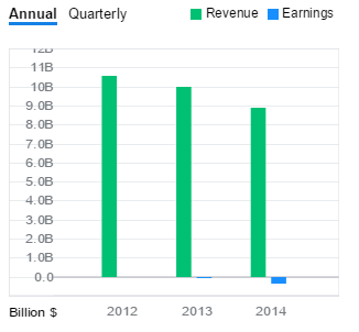 先看上面财报,在 2011 年,雅芳创下公司历史上最高的年营业额--113 亿美元。但从 2012 年开始,雅芳的营收和市值都步入了漫长的下跌通道。2012 年录得亏损4350万,2014 年亏损扩大到 3.8 亿,2015年前3个季度亏损就高达 8.13亿美元。