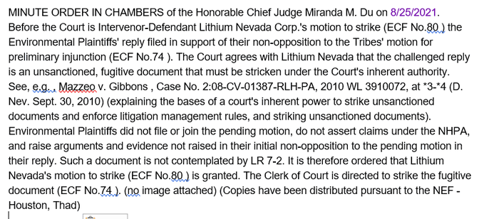 The honorable Judge Du sided with Lithium Americas again today and ordered that Lithium Nevada's motion to strike (ECF No.80) is granted. The Clerk of Court is directed to strike the fugitive document filing from the environmental plaintiffs (ECF No.74). GO LAC!!