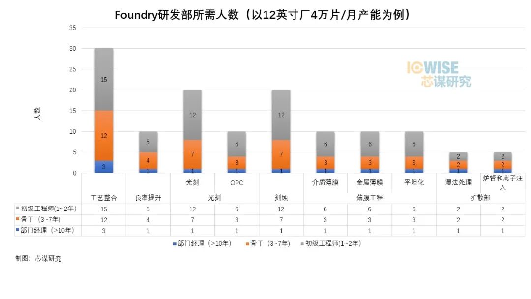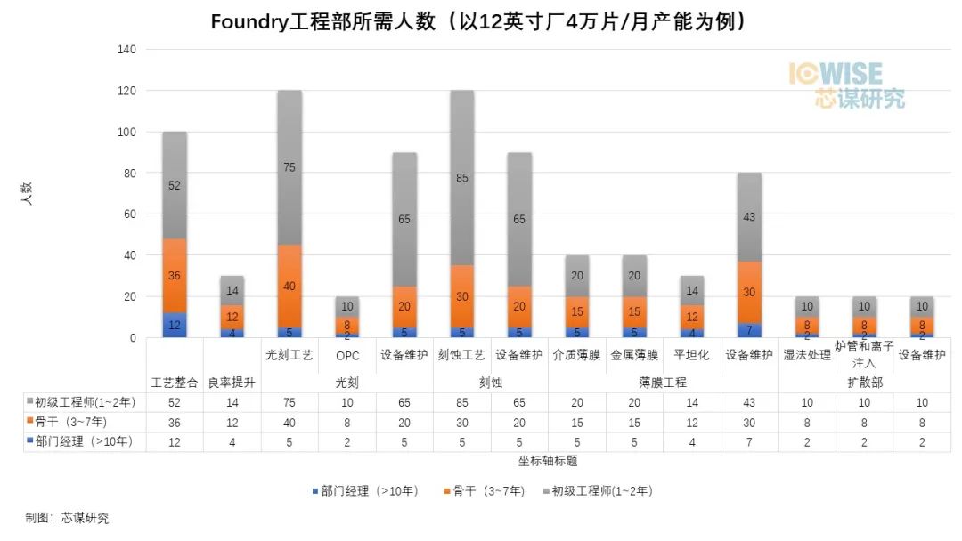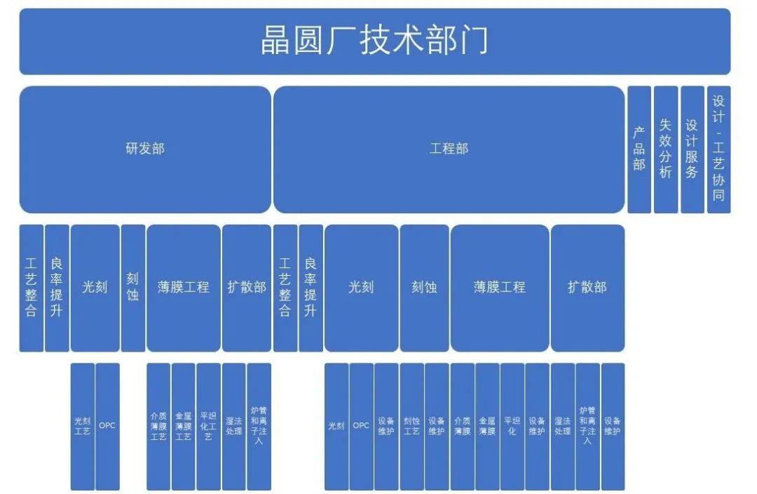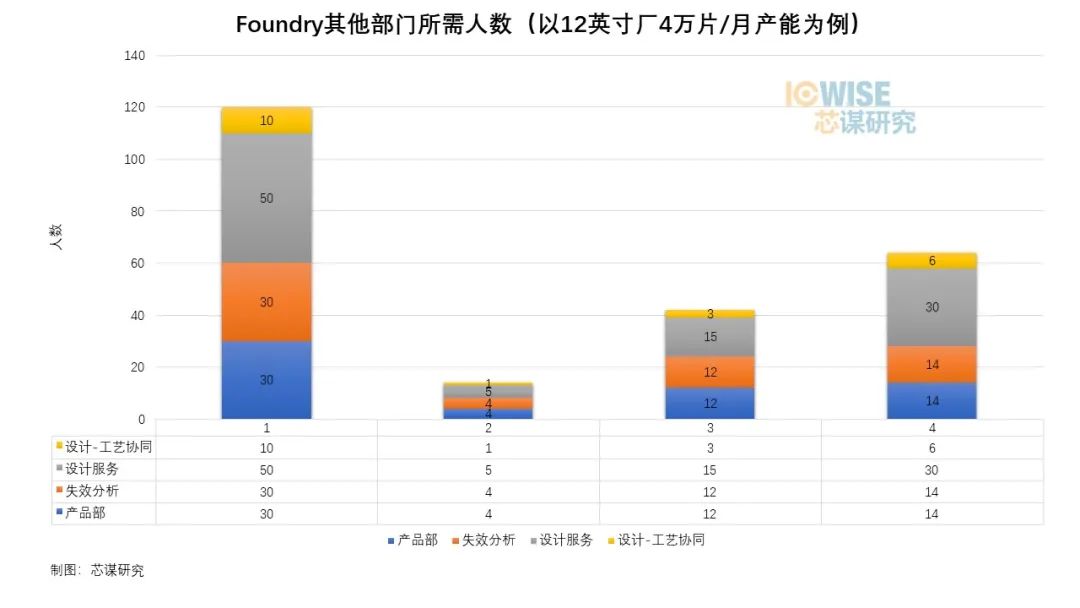 新建一条产线需要多少技术相关人才?以一个月产能4万片的12吋晶圆厂为例,其核心部门如下: