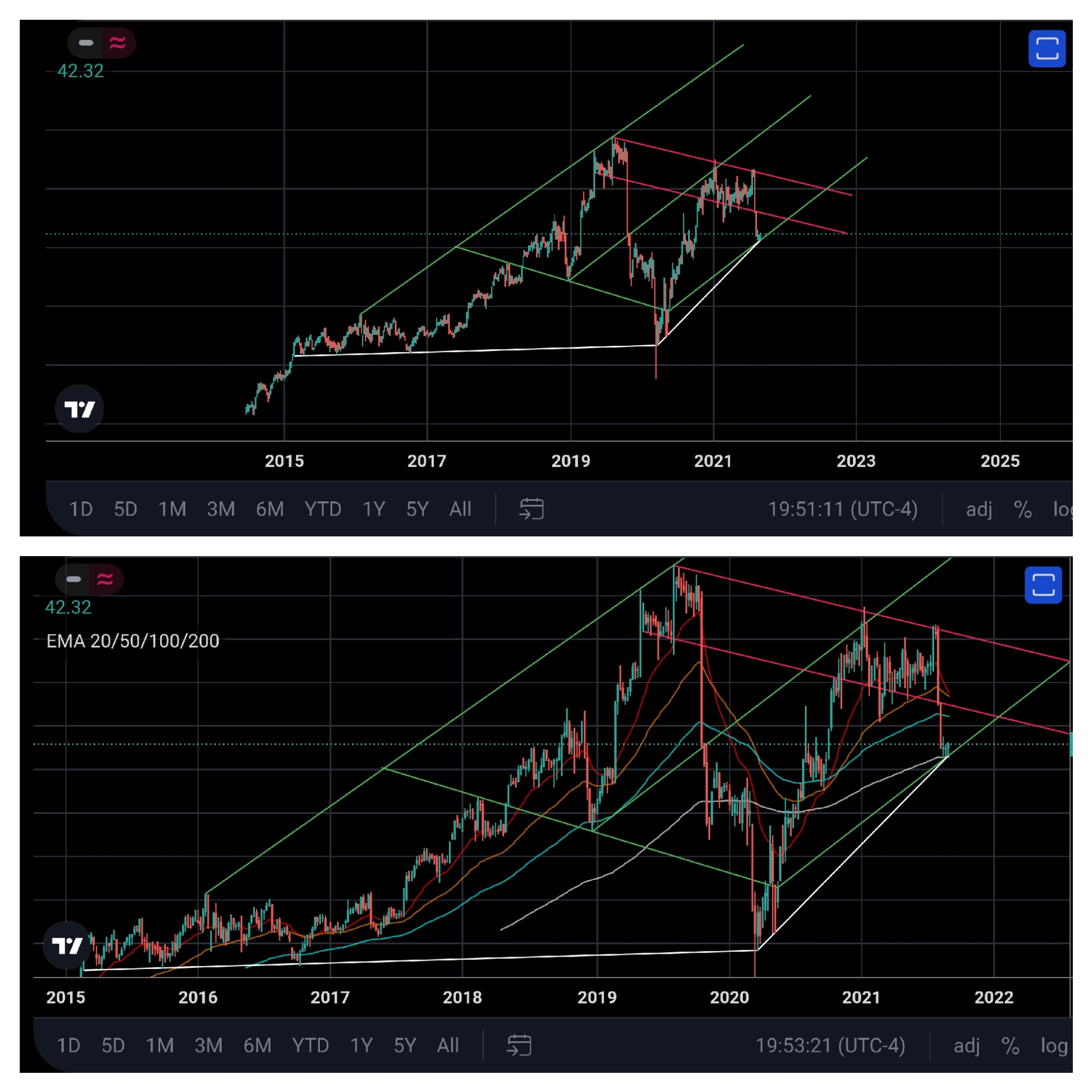 $Terminix Global Holdings Inc(TMX)$ Sorry to spam but I have posted charts for next week in$Tilray Inc.(TLRY)$ $Zomedica Pharmaceuticals Corp.(ZOM)$ $ChargePoint Holdings Inc.(CHPT)$ $Suncor(SU)$ and I think if you're paying attention to any of those you should definitely pay attention to this 🤷♂️ Soooo The Daily chart on this looks great with RSI Breakout and TSI about to cross up...... I have posted that chart to the board as well.....The other thing about this chart is that after studying the Weekly more 👇 it looks like a Gigantic Fork on support that just so happens to coincide with the 200 EMA 🤔 I definitely think this is one to pay attention to🍀