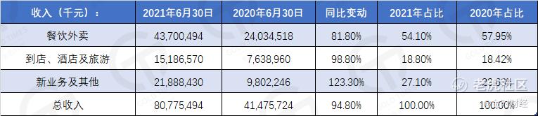 8月30日,美团发布2021年第二季度业绩及半年报,数据显示,2021年上半年,公司的公司营收达807.75亿,较去年同比增长94.80%;其中,餐饮外卖营业收入达到437亿元,到店、酒店收入151.87亿元,新业务及其他218.88亿元。