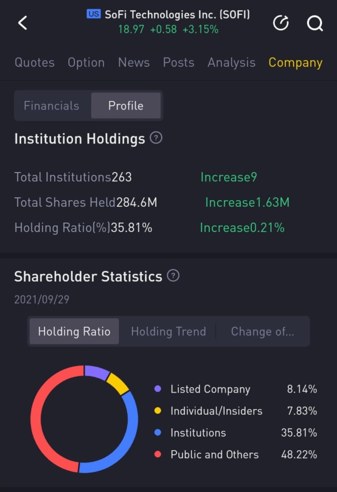 $SoFi Technologies Inc.(SOFI)$as investor we have to take note on the institutions ownership have increase from 11% back in June 2021 to latest 36% (as Oct 12, 2021). Yesterday alone it have increase by 7% (from 29% to 36%), as the increase of institutions ownership, it means SoFi is heading in the right bullish direction 🚀🚀🚀.