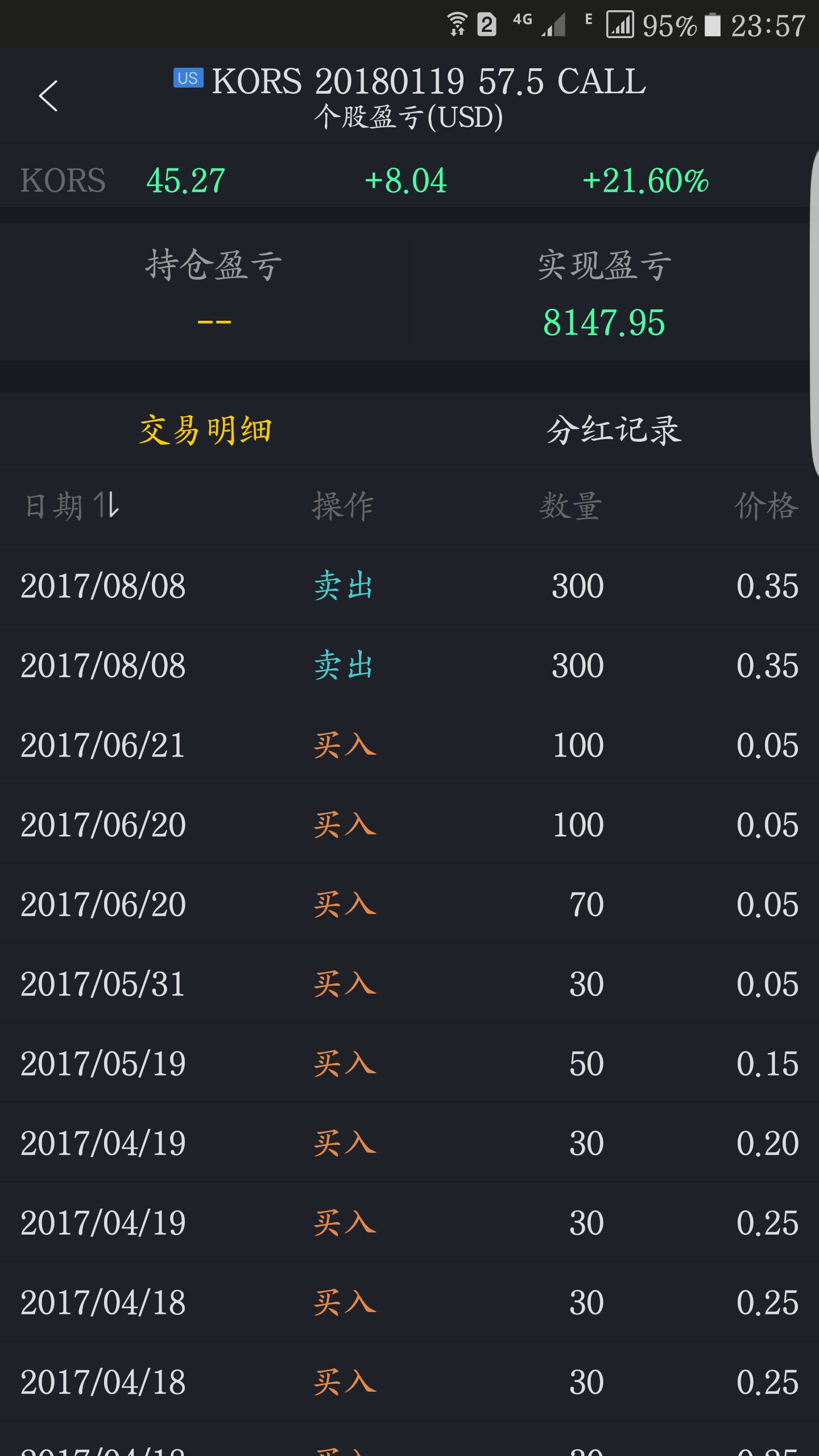 #每日一单#昨天Kors财报双Beat,股票大涨,借利好出货,从亏损9900刀,到盈利8100刀,来了个大逆转,从2016年12月开始建仓,越跌越买,最终结果还不错,但是教训也不少。借用《证券投资》里的开篇语形容现在的心情:现在依然衰朽者,将来可能重放异彩。现在备受青睐者,将来却可能黯然失色。炒股心态很重要,得意不忘形,惊慌不失措。