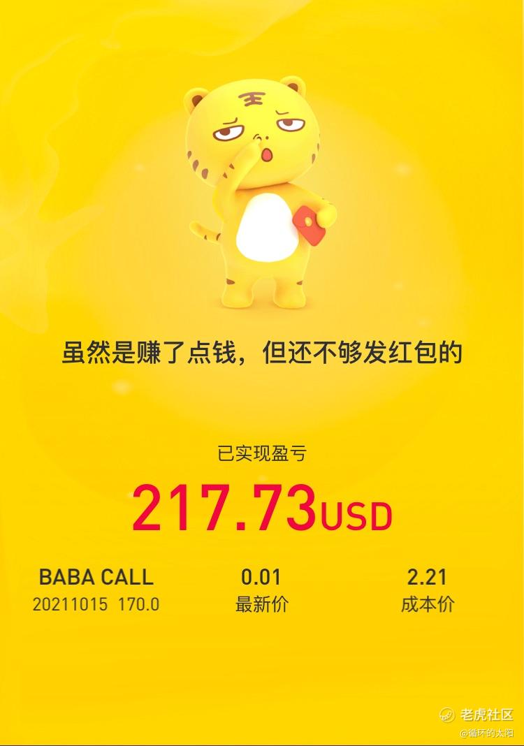 $BABA(BABA)$10月11号卖出的一张 到期日为10月15日,行权价为 170 的 阿里巴巴 call ,组合成一张 covered call 策略,如果股价超过 170 ,我的股票将会以170的价格卖出,如果价格不超过170,那么权利金就归我了,索性上周五的价格没有超过 170 ,期权被自动平仓作废,净赚权利金 200💲#备兑看涨策略