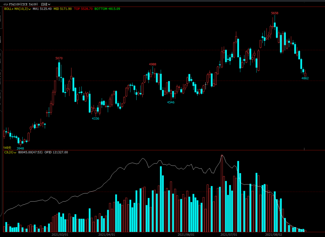 但是在跨期的处理不好,一直认为9月份会累库,推荐反套机会,6月份之前确实反套为主(走势偏向震荡),但是6月底到7月底,投机资金关注低估值的PTA,叠加供应恢复不及预期,开始疯狂拉正套(波动也很大,并且时间短)