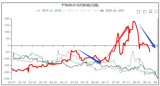 PTA的09合约是预期差最大的合约,4-5月份时候,市场普遍觉得PTA检修季将结束,7月份以后将重回累库压力,但多套装置意外故障频繁、新装置投产进程不及预期、下游聚酯需求刚需维持的背景下,PTA累库预期迟迟没有兑现,走了修复预期的上涨行情,单边大机会是上涨(但是说实话,波动太大了),9-1价差结构发生改变(正套走势非常流畅)。